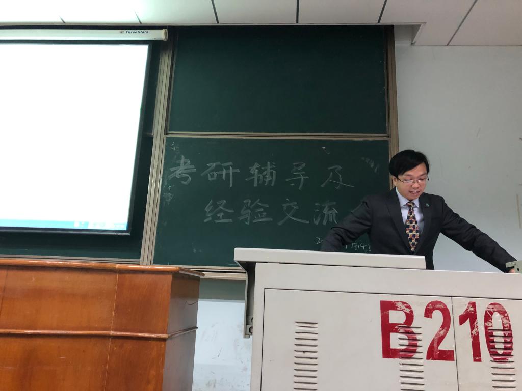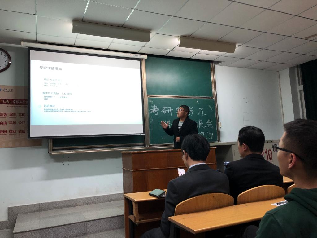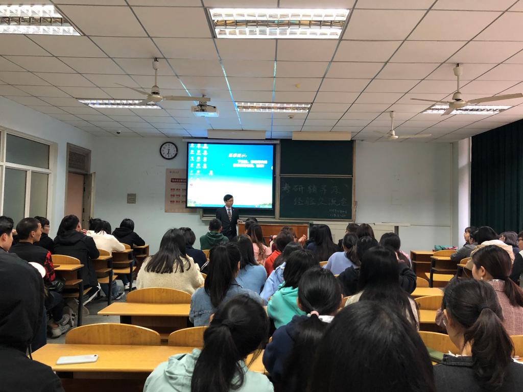接着,由考研成功的学长、学姐分享考研经验。戴昌茂学长用两组数据指出了报考本校的优势,并鼓励大家报考本校。包宝伦学长给大家推荐了考研书目并分享了自身考研的方法,如:利用微信公众号、APP、百度网盘等工具搜集考研资料;重视历年真题,最好一篇一篇的过,一遍一遍刷;合理安排复习时间,前期重视专业课和英语,后期开始复习政治,考试时间上勿以熟悉而多写,勿以陌生而不答。张畅学姐特别强调了英语的重要性,员工可以结合自身的英语水平选择报考院校。刘迪学姐指出在复习时应尽可能的阅读多版教材,多研究历年真题,通过时间规划表合理安排复习时间。易文艳学姐给大家提供了一些心态上的建议,如:注意劳逸结合,避免长时间、高强度学习 ;后期要注意调整心态,不想太多,不放弃,把考研当做一项平常的任务;复习时不要自我感动,不要盲目复制别人的成功,找到属于自己的方法。