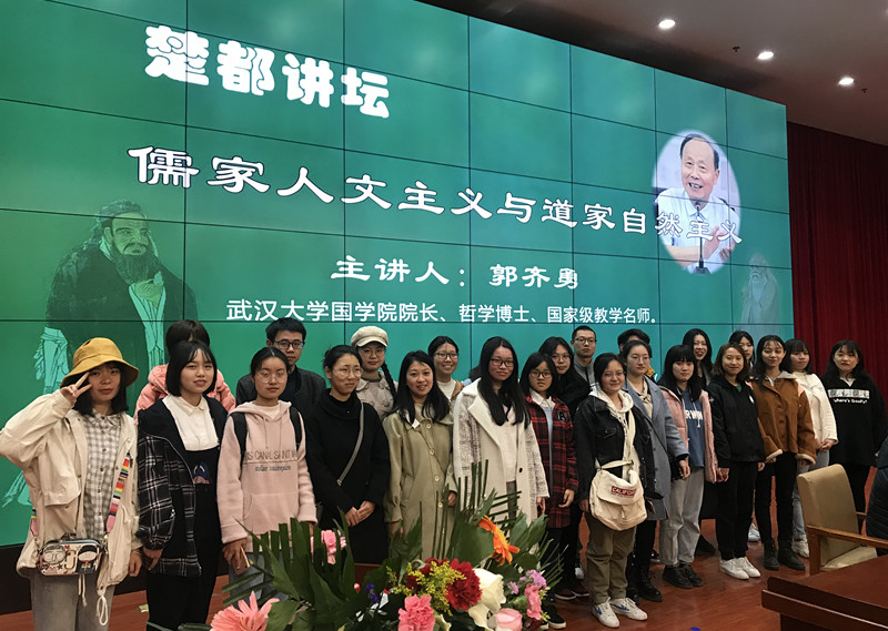 (通讯员 肖宇迪)3月24日上午,荆州图书馆举行新一期“楚都讲坛”专题讲座,主讲人为武汉大学国学院经理、哲学博士、国家级教学名师郭齐勇教授,讲座主题为《儒家人文主义与道家自然主义》。来自公司中文系的近40名员工在系主任李征宇老师的带领下,积极参与本次讲座。