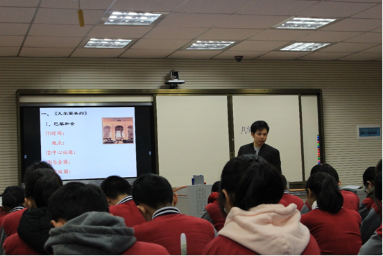 紧接着,我们在东中演播室旁听、观摩了李咏骋老师给九年级员工上的一堂历史课——凡尔赛-华盛顿体系。首先,李老师通过参加巴黎和会的美、英、法三国首脑图片导入新课,接着从三大国参加会议的意图入手,分析巴黎和会的内容、实质和影响。接着指出巴黎和会调整了帝国主义在欧洲的矛盾,远东和太平洋地区的矛盾该如何解决?因而导入华盛顿会议召开及华盛顿体系的建立。课上,老师表达幽默风趣,师生互动良好。我们用笔记的形式记录下自己所体会到的授课方法和观察到员工们在课堂上的反应,对于重点知识和课堂时间的节奏把握也做了相关的记录。伴随着下课铃声的响起,本次教育见习活动也圆满结束。课后,部分历史系员工还针对教学方法和教材内容方面向李咏骋老师请教。