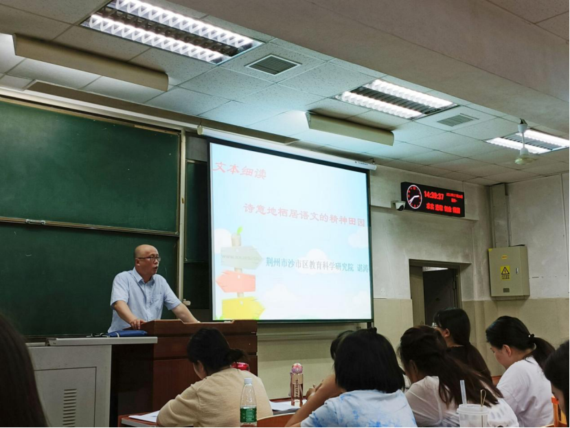 下午,“文本细读:诗意地栖居语文的精神田园”的讲座在荆州市沙市区教科院的谌涛老师一番深情吟诵中拉开序幕。腹有诗书气自华且深耕教学一线多年的谌老师一针见血地指出中小学教师的现实生活是“备、教、辅、考、研、评、改”,但又诗与远方地畅想中小学教师的理想生活应是“琴、棋、书、画、诗、酒、花”。讲座分别从“什么是文本细读”“为什么要文本细读”“文本细读存在的问题”“文本细读的方法与策略”“文本细读的独门诀窍”“经典文本的解读与教学指导”依次进行申述,讲课语言幽默有趣,课堂气氛活跃,授课内容更是让人耳目一新,带来极大的精神享受。