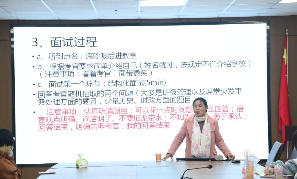 讲座伊始,周霜老师从知识、仪表和心理三个层面向同学们讲述了面试之前需要做的准备,特别强调了面试者心理上的放松状态,鼓励同学们以一个昂扬自信的良好精神面貌去面对教资面试。随后,周霜老师为大家展示了面试的基本步骤和过程,提醒同学们要注意看清自己的考题并把握好时间。同时,周老师还强调了板书环节的重要性,她说到,“板书要体现出教学内容的核心,并且板书时要注意汉字的笔画顺序。”