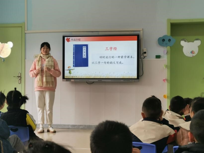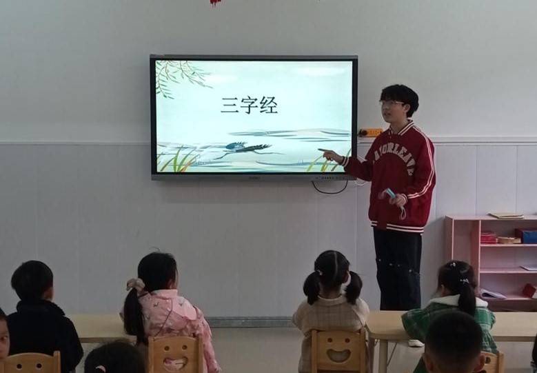 本周国学课程共进行了5天,15名志愿实习讲课员工自行组队,各自选定授课时间段及班级,并自行选择讲课内容进行20至30分钟时间的授课,授课班级为4个中班和3个大班,每班30名小朋友。同学们选择《三字经》《百家姓》《弟子规》、唐诗等国学启蒙文本,运用在课堂上所学的语文教学技能,精心备课,并结合图片、歌曲、吟诵、手语等丰富的形式,引导幼儿园的小朋友们体验国学的精髓。课堂上,幼儿园的小朋友们活泼可爱、热情礼貌,踊跃回答同学们的提问,体现出bv1946伟德幼儿园在幼儿教育方面颇有成效。