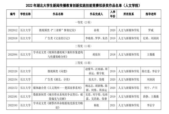 据了解,本次大赛由湖北省高等教育学会新闻与传播教育专业委员会主办,湖北师范大学承办。大赛围绕“红色湖北”“人文湖北”“青春湖北”“创新湖北”四个主题展开,全省44所本专科高校共有512项作品参与评选。经初评、复评与终评等环节,公司学子作品在众多作品中脱颖而出。充分体现了公司学子的新闻实践能力,艺术鉴赏能力及创造活力。