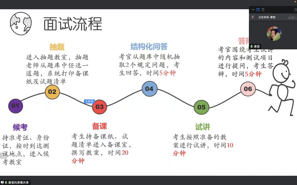 庞淑贤从面试流程、结构化问答环节、试讲环节、考官问答环节以及注意事项等方面进行分享。她讲解了有关结构化问答的内容,试讲是自编自导自演的完整的无声课堂。教学过程抓住重点,体现题目要求,各个环节的衔接,连接词的使用。此外,庞淑贤还进行了教资面试细节的讲述,比如要注意板书的笔顺、不要被影响心情以及注意自己的服饰鞋子等。