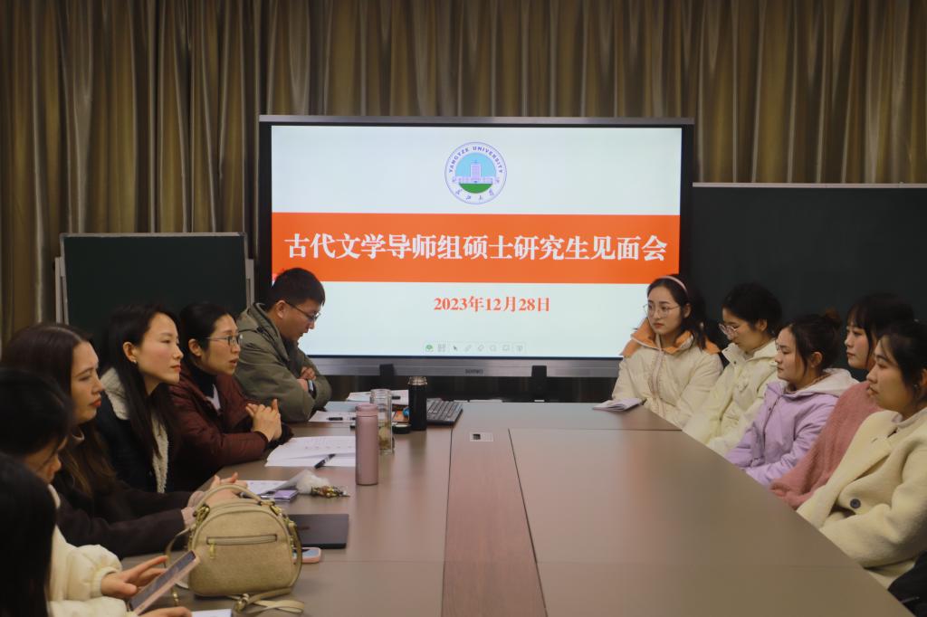 12月28日晚,古代文学教研室在文科楼701会议室举行23级研究生见面,教研室老师吴桂美、李征宇、杨名、章芳、袁咏心、杨伟业和23级古代文学方向的研究生参与本次会议。