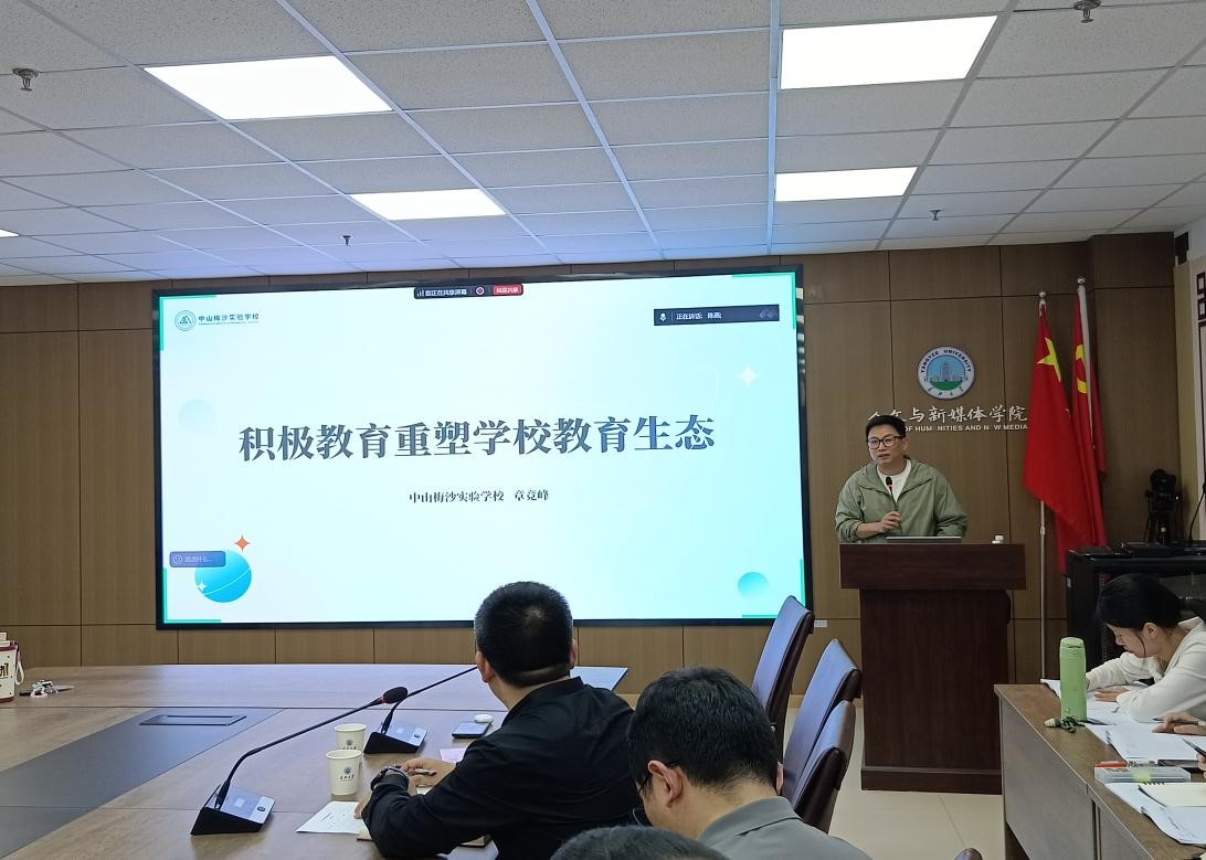 (通讯员 李艺涵)2025年4月9日下午,中山梅沙实验学校总董事长章竞峰受人文学院邀请,在文科大楼705会议室开展了题为“积极教育重塑学校教育生态”的专题讲座。本次讲座由杨家海副经理主持,章芳老师、卢川老师、刘金勤老师以及本院三十多名研究生参加了此次讲座。