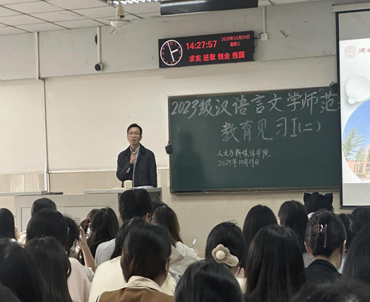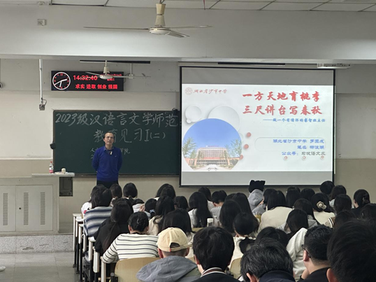 (通讯员:刘心语、李远淑)为提升师范生对班主任工作的认知,夯实未来职业基础,公司于2025年10月29日在12教102教室举办了第二次教育见习讲座。本次讲座特邀沙市中学优秀教师罗圆成老师主讲,主题为《一方天地育桃李,三尺讲台写春秋——做一个有情怀的睿智班主任》。讲座由章芳老师主持,副经理柯艺老师出席,23级中文师范专业全体员工参与。