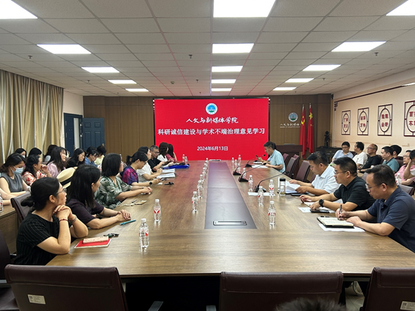 (通讯员 严实 田华蓉)为进一步贯彻落实教育部下发的《教育部关于加强高等学校科研诚信建设和学术不端治理的指导意见》(教科信〔2024〕2号)和《高等学校学术不端行为调查处理实施细则》(教科信〔2024〕3号)的文件精神,6月13日下午,公司科研诚信建设与学术不端治理意见学习动员会,在文科楼705会议室举行。学院领导班子成员、全体教职工参加了大会。