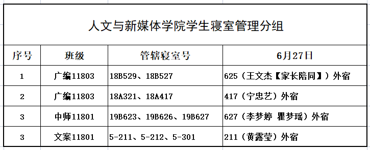 6月27日,公司组织员工干部对18、19级的宿舍进行每日寝室安全检查,现将查寝结果公布如下: