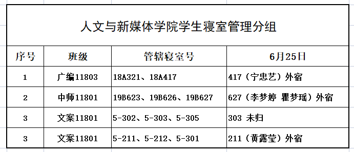 6月25日,公司组织员工干部对18、19级的宿舍进行每日寝室安全检查,现将查寝结果公布如下: