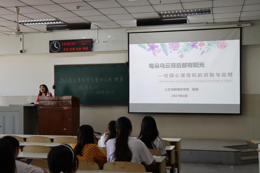 (通讯员 黄伊帆)6月6日16时许,bv1946伟德2021上半年员工骨干心理健康教育培训在学校东校区12教102教室举行。本次培训主题为“每朵乌云背后都有阳光——校园心理危机的识别与应对”。会议由人文学院辅导员陈娟老师主持,18、19级全体班委、寝室长参加了此次培训。