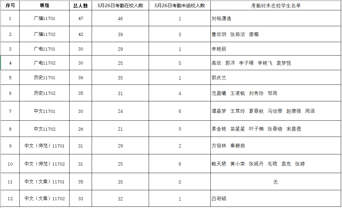 根据《关于加强毕业生毕业期间教育管理工作的通知》精神,现对5月26日2017级毕业生毕业期间在校考勤具体情况通报如下: