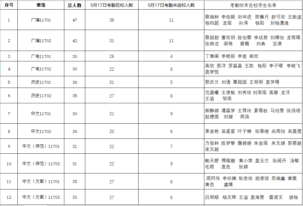 根据《关于加强毕业生毕业期间教育管理工作的通知》精神,现对5月17日2017级毕业生毕业期间在校考勤具体情况通报如下: