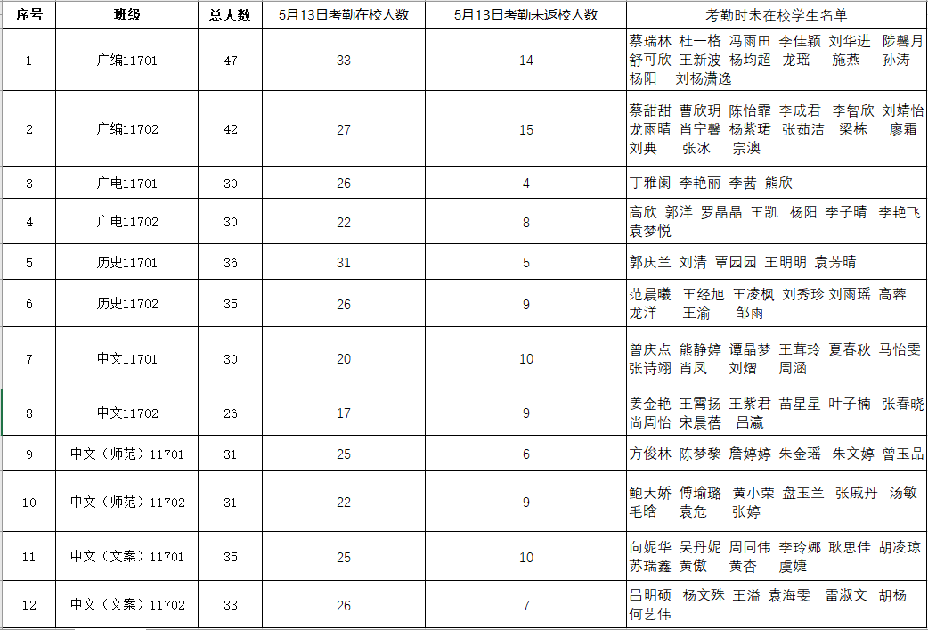 根据《关于加强毕业生毕业期间教育管理工作的通知》精神,现对5月13日2017级毕业生毕业期间在校考勤具体情况通报如下: