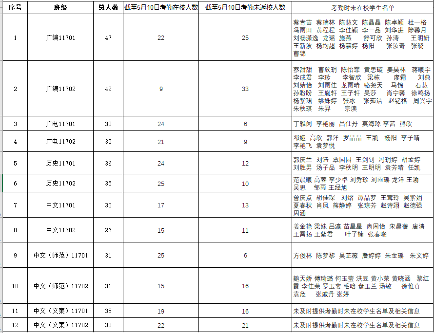 根据《关于加强毕业生毕业期间教育管理工作的通知》精神,现对5月10日2017级毕业生毕业期间在校考勤具体情况通报如下: