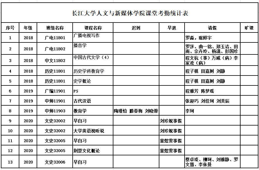 4月29日,公司组织员工干部对18、19、20级30个班的20门课程进行56次课堂考勤,100%到课率43次,现将考勤结果公布如下: