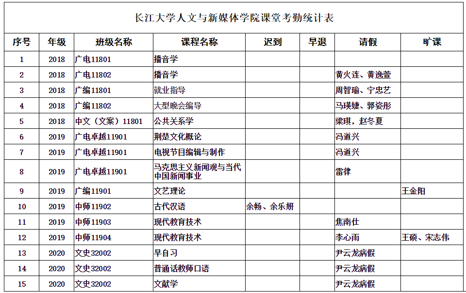 4月13日,公司组织员工干部对18、19、20级30个班的34门课程进行了68次课堂考勤,100%到课率56次,现将考勤结果公布如下: