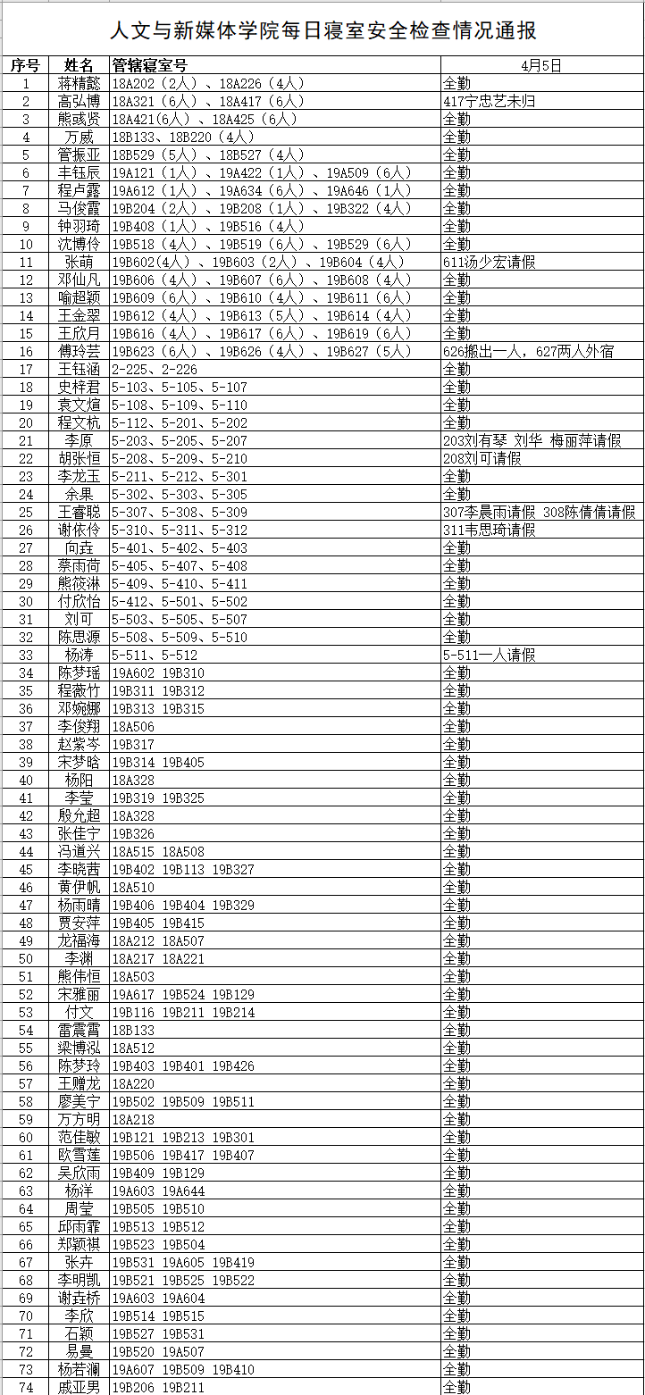 4月5日,公司组织员工干部对18、19级的宿舍进行每日寝室安全检查,现将考勤结果公布如下: