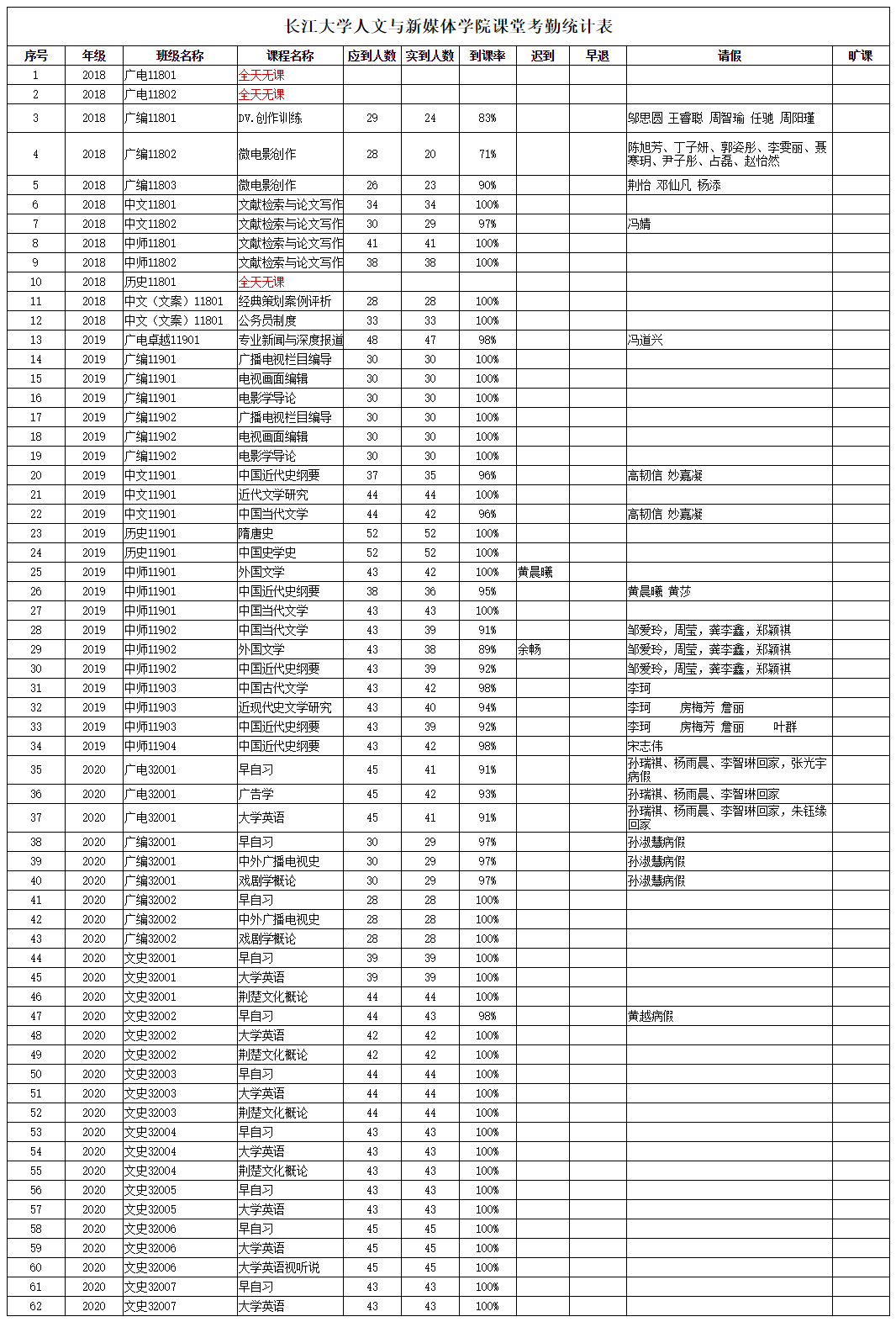 4月2日,公司组织员工干部对18、19、20级30个班的24门课程进行了62次课堂考勤,100%到课率37次,现将考勤结果公布如下: