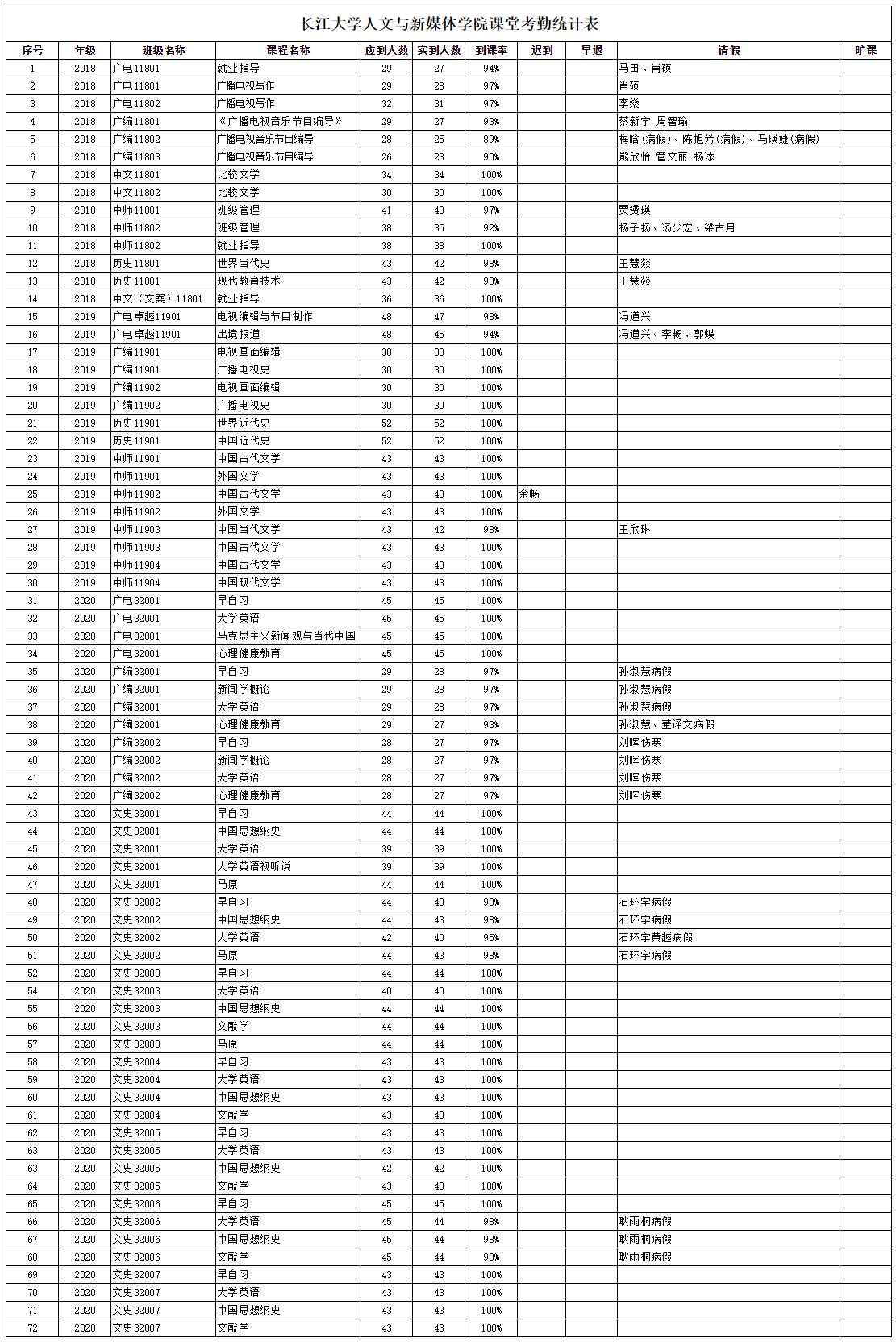 3月31日,公司组织员工干部对18、19、20级30个班的32门课程进行了72次课堂考勤,100%到课率44次,现将考勤结果公布如下:
