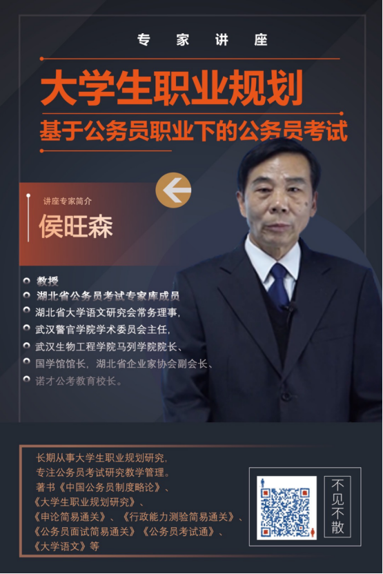 侯旺森,教授,湖北省公务员考试专家库成员,湖北省大学语文研究会常务理事,武汉警官学院学术委员会主任,武汉生物工程学院马克思主义学院经理,国学馆馆长,湖北省企业家协会副会长,诺才公考教育董事长。