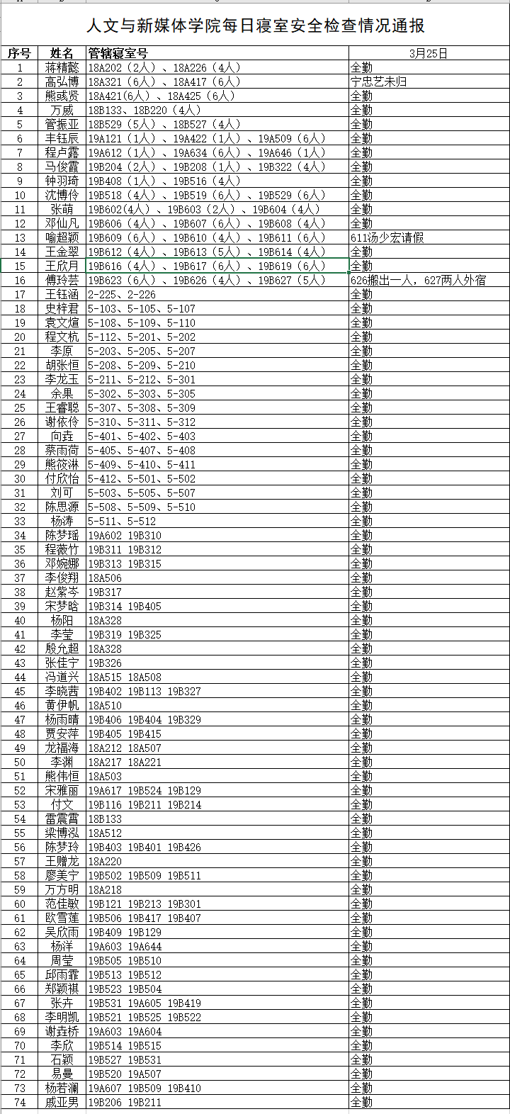 3月25日,公司组织员工干部对18、19级的宿舍进行每日寝室安全检查,现将考勤结果公布如下: