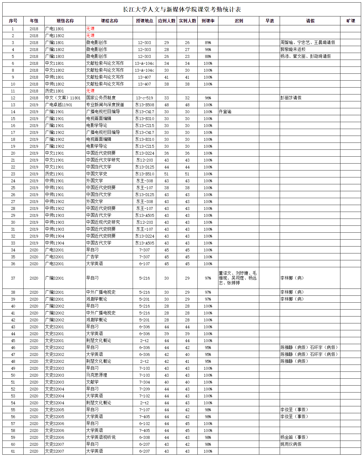 3月19日,公司组织员工干部对18、19、20级30个班的23门课程进行了61次课堂考勤,100%到课率43次,现将考勤结果公布如下: