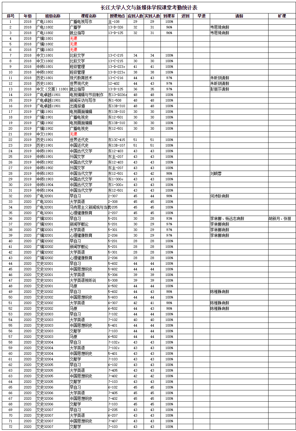 3月17日,公司组织员工干部对18、19、20级30个班的26门课程进行了72次课堂考勤,100%到课率55次,现将考勤结果公布如下: