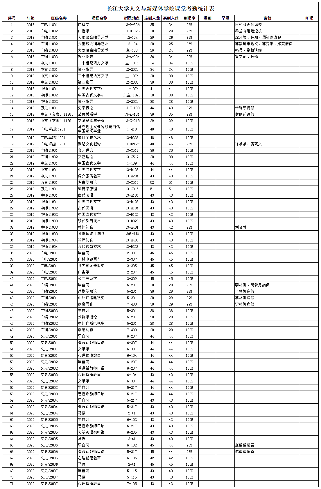 3月15日,公司组织员工干部对18、19、20级30个班的33门课程进行了71次课堂考勤,100%到课率56次,现将考勤结果公布如下: