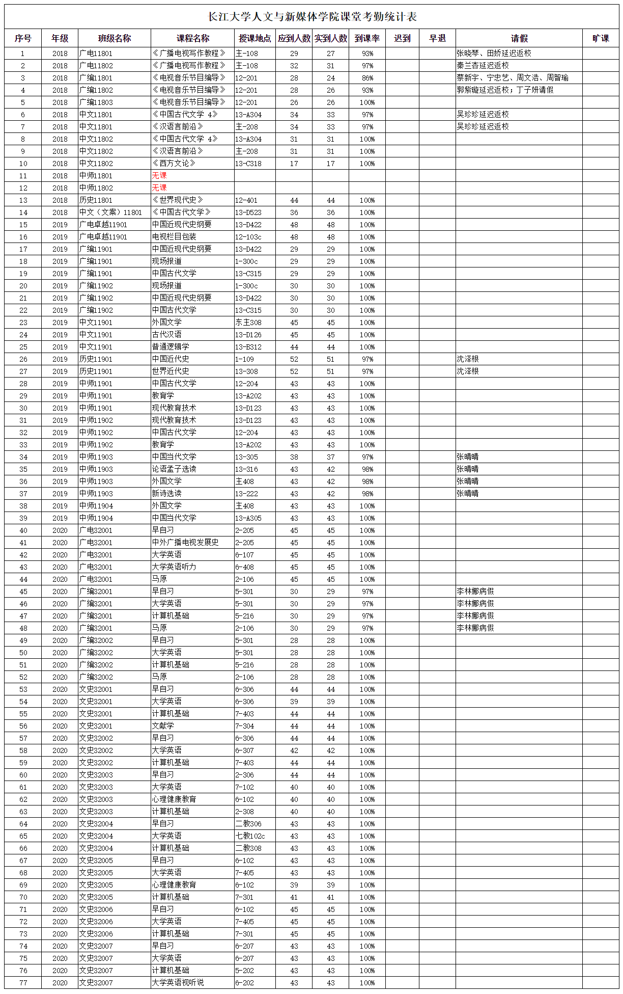 3月8日,公司组织员工干部对18、19、20级30个班的30门课程进行了75次课堂考勤,100%到课率59次,现将考勤结果公布如下: