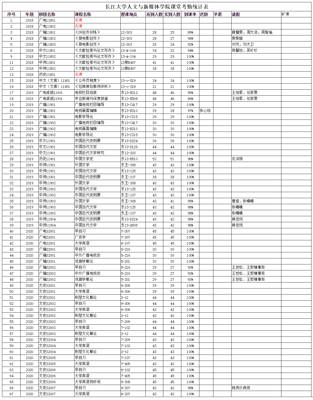 3月5日,公司组织员工干部对18、19、20级30个班的24门课程进行了64次课堂考勤,100%到课率43次,现将考勤结果公布如下: