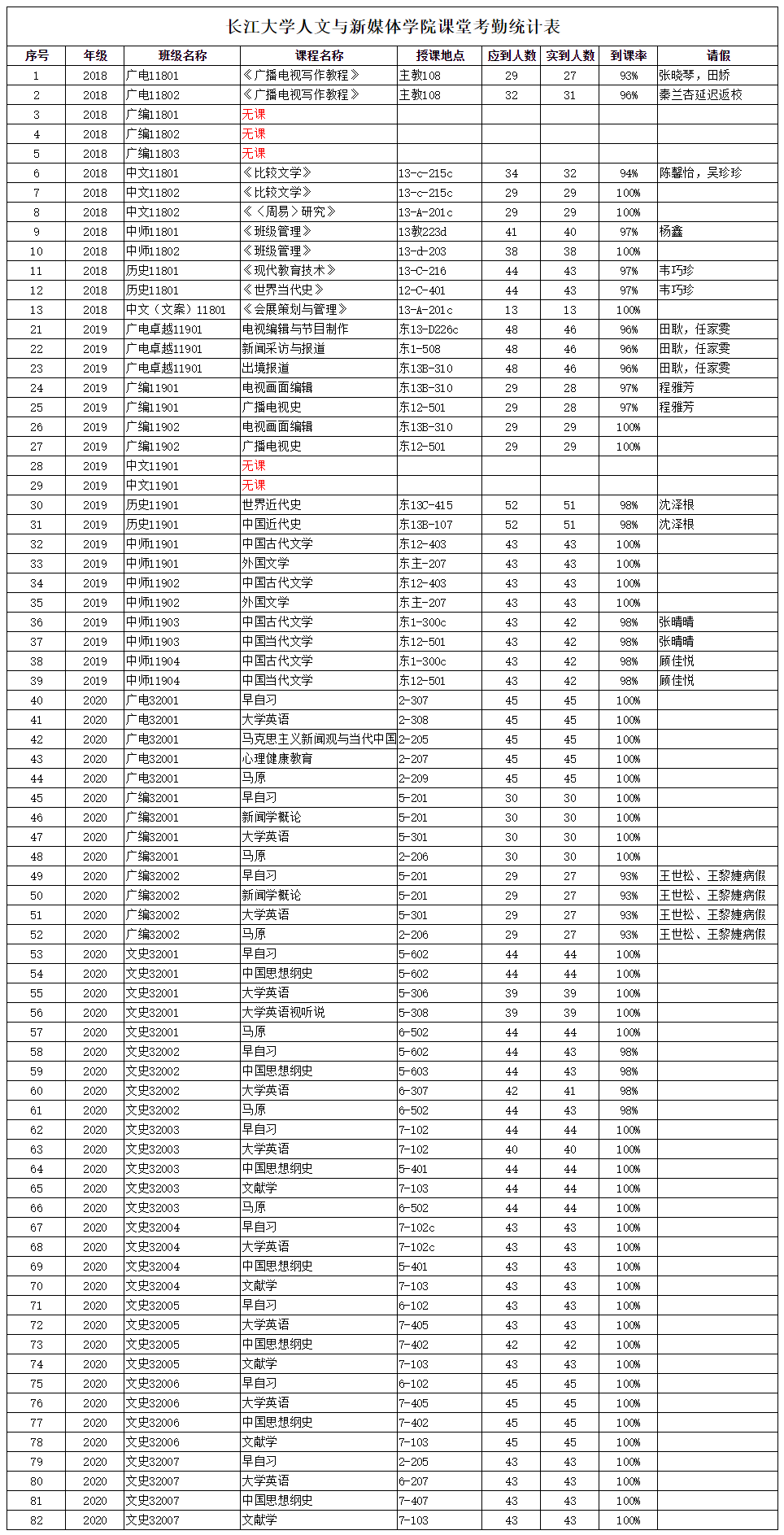 3月3日,公司组织员工干部对18、19、20级30个班的26门课程进行了77次课堂考勤,100%到课率45次,现将考勤结果公布如下: