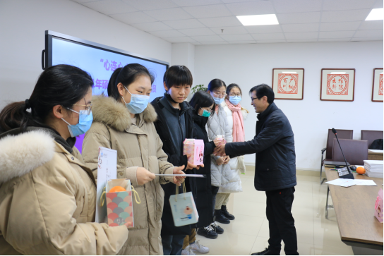 会议由胡世先书记主持。首先,胡书记主要强调了要遵守考试纪律、考前十四天内要做好测温工作、做好考前准备这三件事。随后胡书记拿出了给考研学子的一封信,分发给同学们。随后又拿出为考生准备的礼物盒。他说,一个橙子——意味着一次成功、一盒牛奶——意味着我很牛、一个棒棒糖——意味着我很棒。胡书记讲完后,杨书记在前台为几位员工代表发放礼品盒,并一起合影。殷满堂老师、李文胜老师拿着礼物盒分发给会场的考研学子们。最后,殷满堂老师说希望同学们继续努力,在考试中取得好成绩。李文胜老师表示愿给同学们最大的帮助去迎战。老师们的话赢得了同学们热烈的掌声。