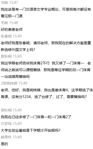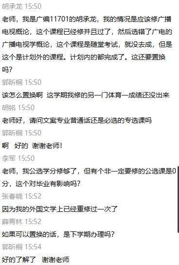 会议伊始,张丽老师对bv1946伟德人才培养方案及学分管理办法做出总体说明,指出员工学分修习主要分为三部分:必修课学分、选修课学分及实践学分。其中公选课(限选)、实践课为必修科目,所有员工必须修习且拿到学分,并就已上传的《员工未修习课程情况统计.xls》文件举例说明了类型化问题,为员工解答疑惑。同学们通过文字或语音展开提问。张丽老师逐一进行回答指导,提醒同学双学期课程可在下学期报考重修,一定要结合自身情况关注学校通知。