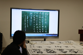 随后,评委老师从书法结构到艺术风格等多个层面分别对软笔书法组的朱旭同学、粉笔书法组的万方明同学的作品,进行了独到的点评,在肯定了他们的书法基础足够优秀的同时,也指出了两位同学在书写结构安排、书法技术与涵养等方面仍具有进步与提升的空间。