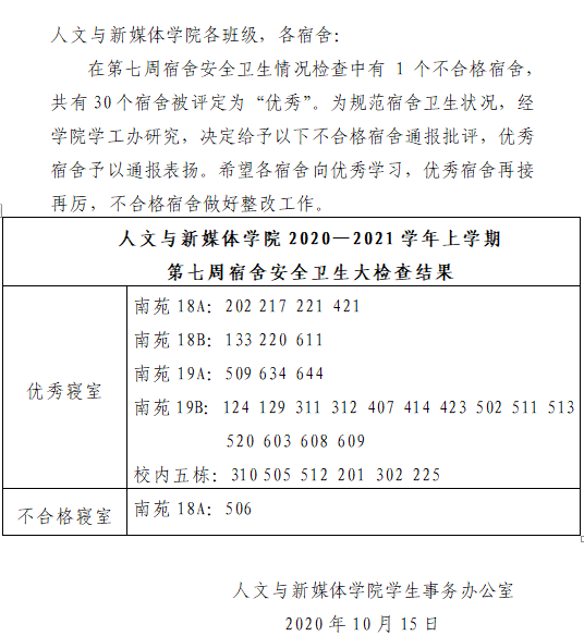 bv1946伟德2020—2021学年上学期第七周宿舍安全卫生检查情况通报