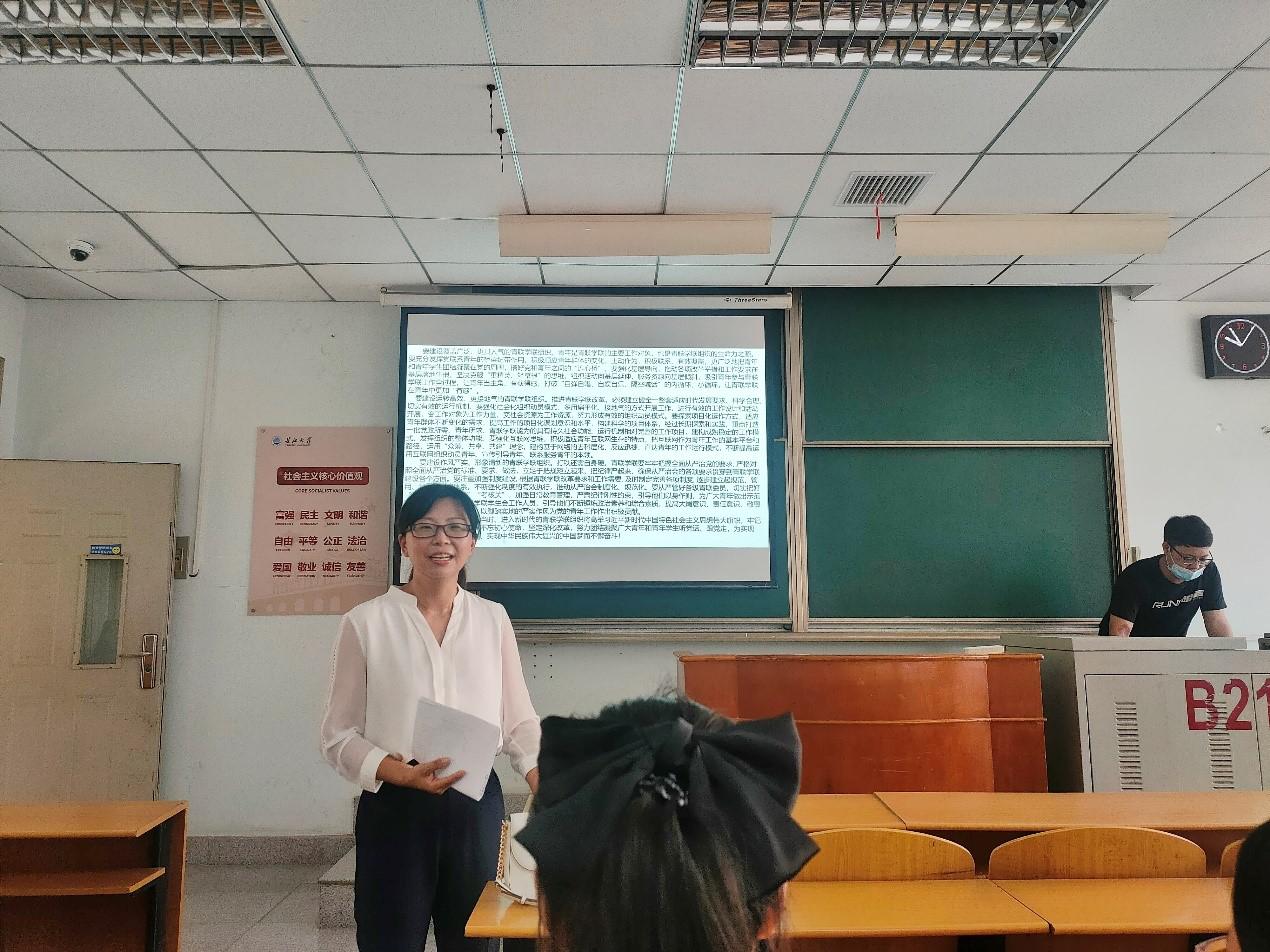 谭进同学由“习近平主席向复旦大学《共产党宣言》展示馆党员志愿服务队全体同志回信”的材料导入。从何为信念、为何坚定信念、如何坚定信念等三方面展开,通过PPT展示的方式,让同学们了解到理想信念是“精神之钙”,没有理想信念会使精神滑坡,政党衰亡,坚定理想信念需要以“知识为灯,照亮前行方向;以勇气为桨,划向光明前方”。
