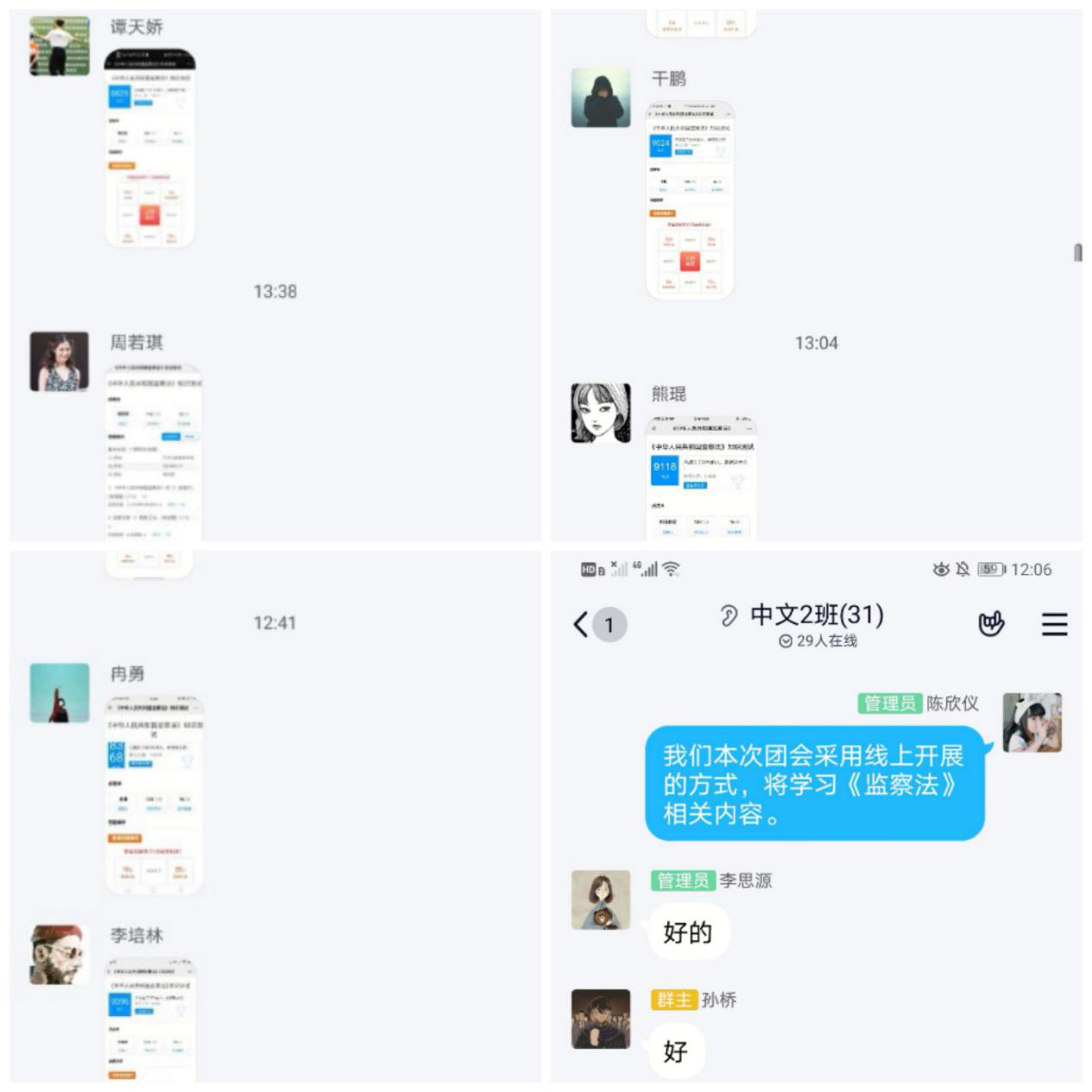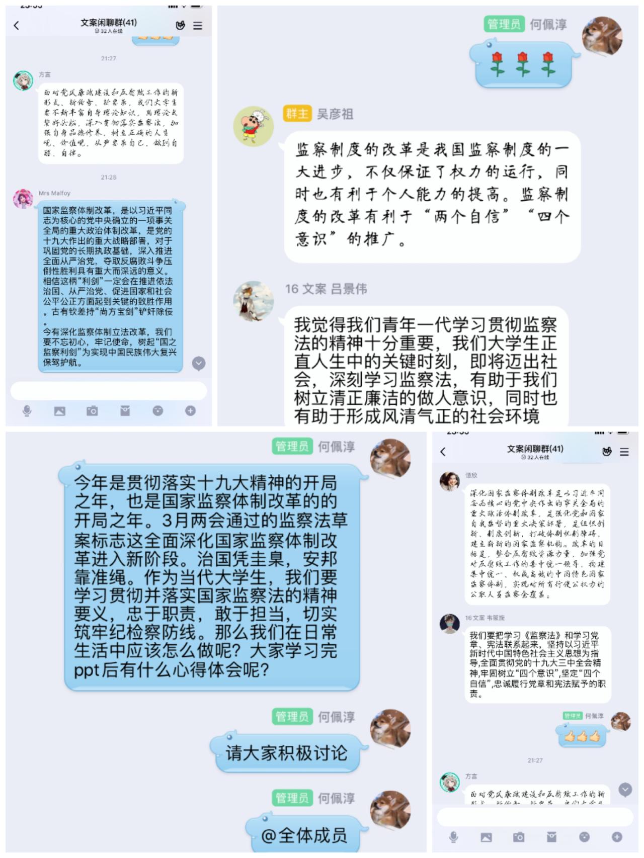 中文(文案)11601团支部支持人何佩淳以毕业季在校老员工初入社会可能面对的各种现实问题为切入口,模拟了毕业生就职后面对权钱交易、卸职渎职等场景及其后果,带领毕业生学习了《学习监察法 争做廉洁人》的专家视频讲座。中文(文案)11601何佩淳从追溯中国古代监察制度入手,循序展开宣讲。他介绍了中国历代检查机构、监察的范围、检察制度的防范作用以及监察法的形成、发展和完备。紧接着他带领班级同学学习了《监察法》主要内容,包括监察机关及其职责、检查范围及其管辖、监察权限、监察程序等内容,使中文(文案)11601团支部全体毕业生深入了解了监察法的主要内容和中心思想,支部同学也对主持人提出的问题反响强烈。支部吕景伟同学认为,学习监察法有助于老员工树立清正廉洁的做人意识,同时也有助于形成风清气正的社会环境。