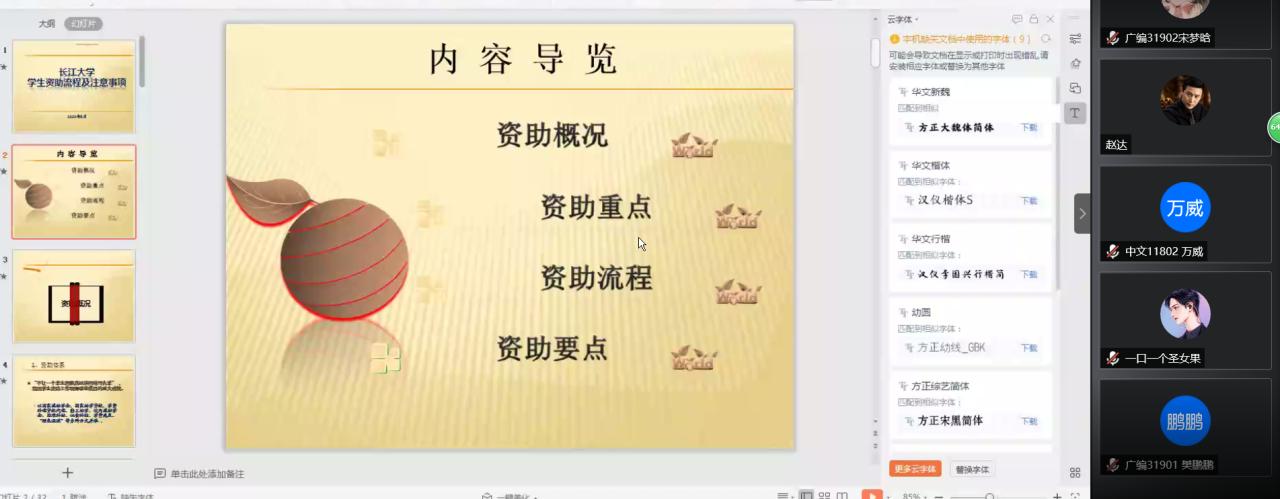 为更好地开展精准资助和资助育人工作,贯彻育人理念,提升资助水平,6月20日,文学院资助培训工作通过腾讯会议形式顺利进行,本次培训对象为文学院17、18、19级班长、团支书等员工干部。陈娟老师主要从资助体系、资助重点、资助流程和资助要点等四大方面进行了详细的讲解。对贫困生认定的程序、各类奖助学金的评审要求、支撑材料的准备、申报表格填写的规定等方面,陈娟老师也都一一进行详细的说明。同时,陈娟老师提醒员工干部要用活政策,培养同学们诚信、感恩意识,把工作做得有意义、有价值!