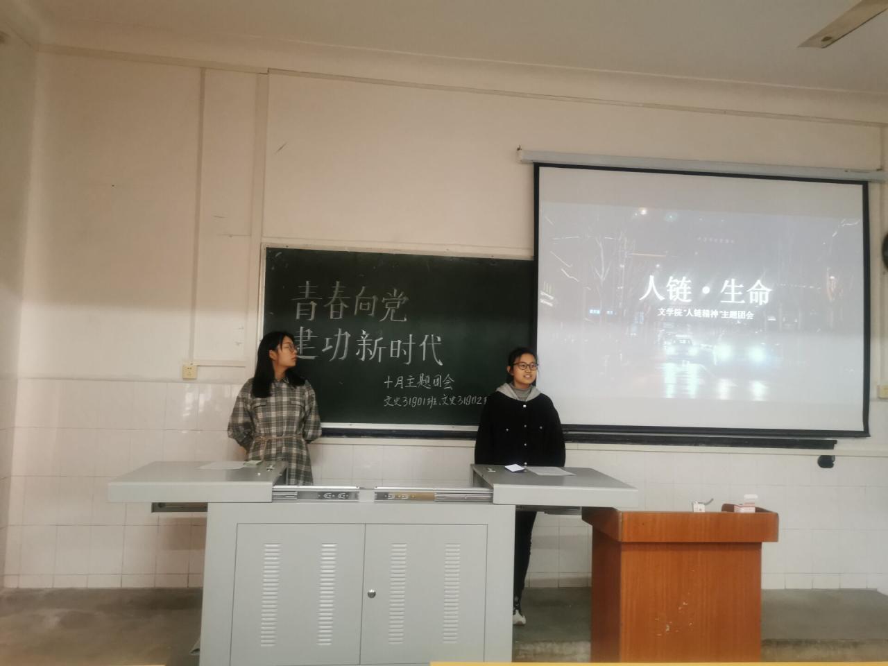 文史31901班团会由一班薛雯昕同学以及二班余乐妍同学共同主持。以“青春向党,建功新时代”为主题,以向“10.24”英雄事件为主线,开展主题团会。