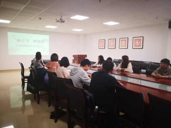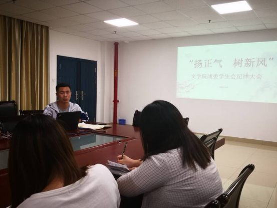 (通讯员 王艺博)“加强三信建设,剔去四化陋习。”10月12日下午4时,文学院团委在文科大楼705召开以“扬正气 树新风”为主题的干部纪律自查大会,文学院团委员工会全体干部出席会议,大会由文学院团委书记李博老师主持。