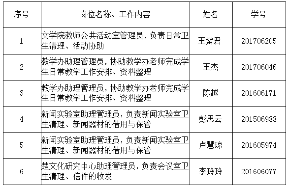 经个人申报、用人办公室审核,最终确定文学院2018年秋季勤工俭学员工人选,现将勤工助学员工名单公示如下: