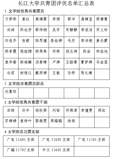 经个人申请、各支部推选、学院团委审核,拟推选姜红等41名同学评为“优秀共青团员”,田甜等12名同学评为“优秀共青团干部”,刘晨阳评为“共青团员标兵”,广电11601支部、广电11602支部、广电11501支部、广编11702支部、中文11602支部评为“活力团支部”,现予以公示(名单见附件)。