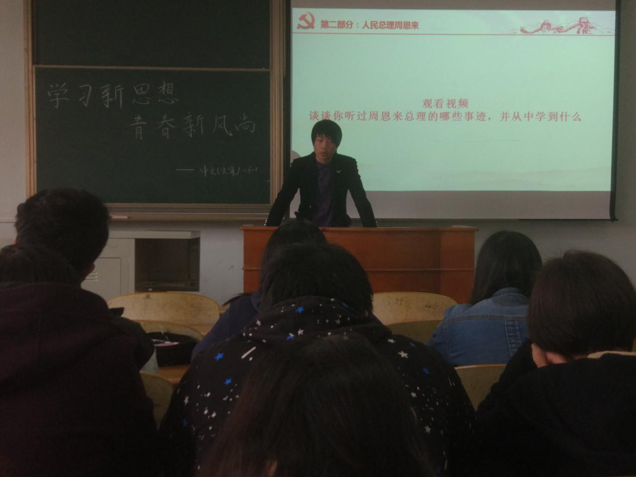 中文(文案)11601班组织同学们一同观看周恩来总理纪念视频,同学们进行自由发言,畅谈观后感,纷纷表示要向周总理学习。