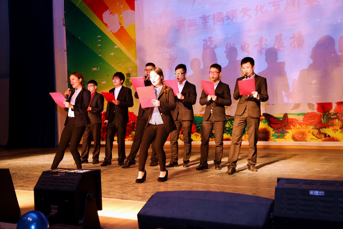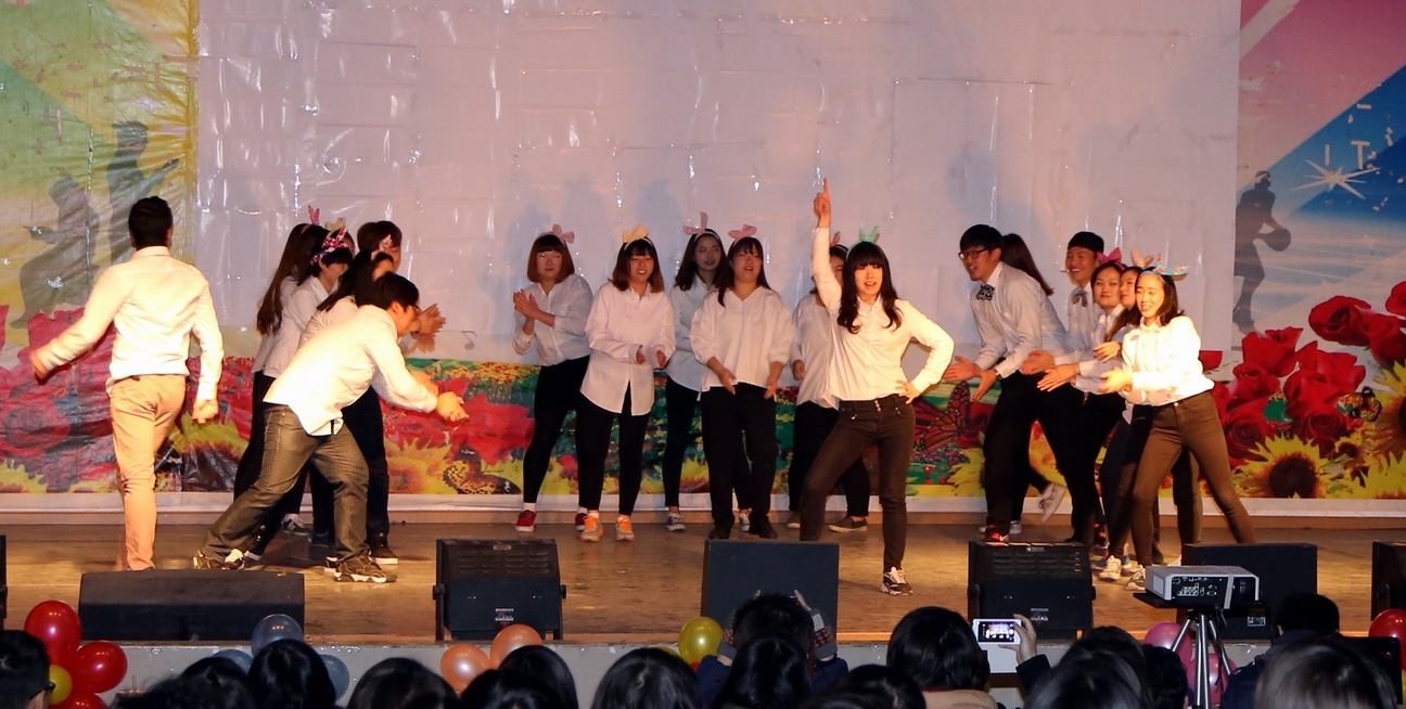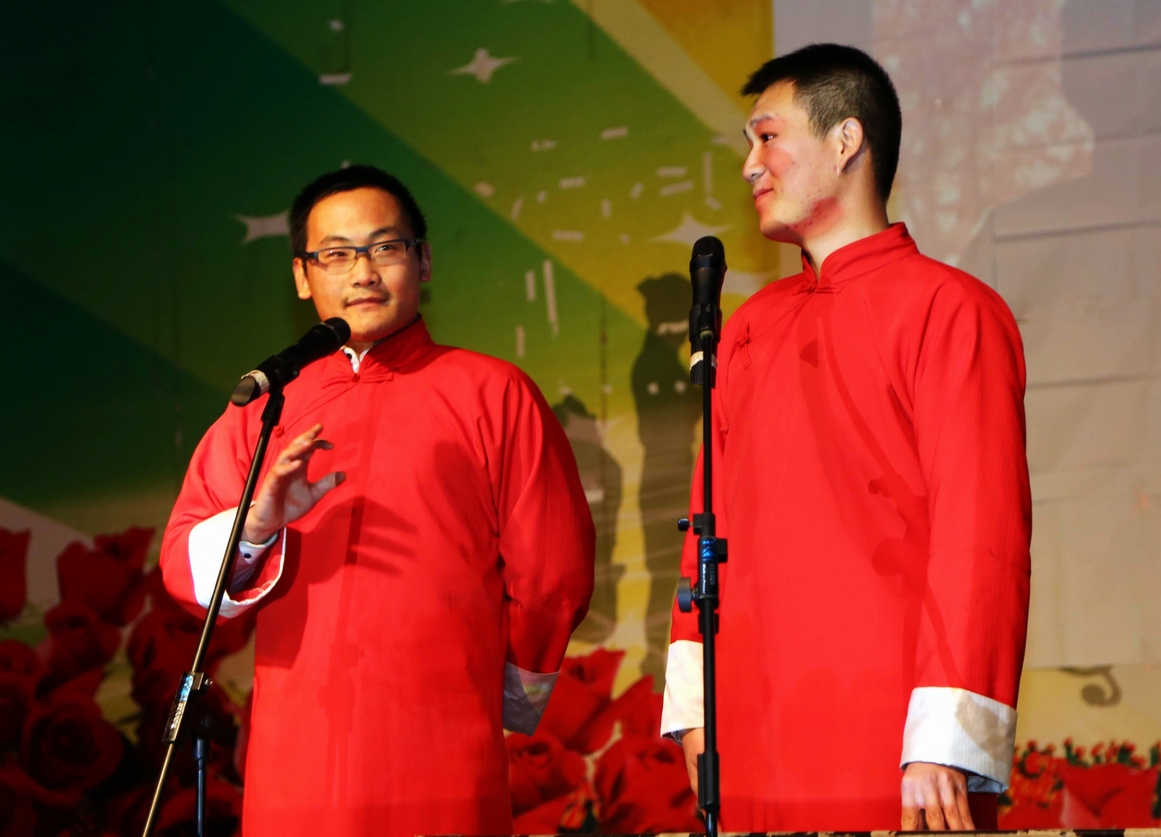 晚会上,韩国友人的舞蹈《lolly polly》瞬间嗨翻全场;诗歌朗诵《商鞅》深情并茂,慷慨激昂;6男加2女“彩色”朗诵《我的滑板鞋》爆笑如雷;“猪是u,猪是i”相声《学英语》幽默无限;中韩情歌对唱《雪之花》歌声动人,掌声雷动。