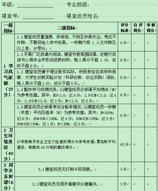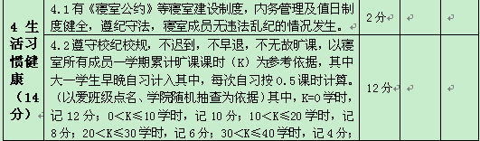 (四)评定办法:卫生环境一项每月单周周四由员工干部检查一次,每月由院领导、老师抽查一次并做好记录,期末评比取平时成绩的平均值;其他各项为每学期一检查,期末进行综合评比。