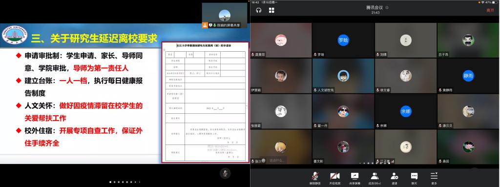 1月10日下午4:30召开了全体研究生寒假安全工作会议,重点强调了疫情防控、消防安全、交通安全、防溺水、防诈骗等安全事宜,嘱咐同学们严格遵守疫情防控管理规定,注意人身安全,确保度过一个平安和谐的假期。