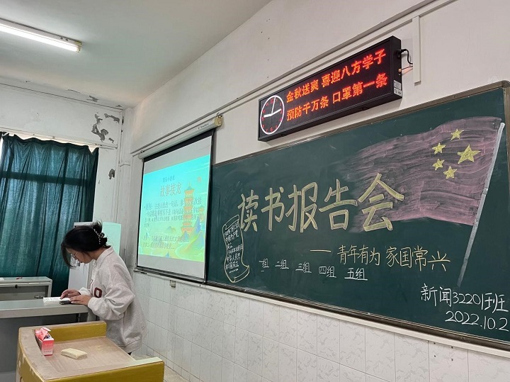 本次读书交流会采取趣味性模式,各班级由2至3名同学进行读书报告,以手稿和脱稿的形式分享自己所读书籍。通过介绍书籍作者、写作背景、作品内容等使同学们对该书籍有初步认识;而后分享读书感悟和个人思考,并互相讨论交流。活动穿插飞花令、趣味小游戏等节目,最后,各班同学共唱《我和我的祖国》,共庆祖国诞辰。同学们积极参与,充分展现对活动的认可和参与的热情,同学们纷纷表示:“以读书的方式为祖国诞辰献礼很有意义,可以督促自己多读书,最重要的是坚定了教育强国的信心。”