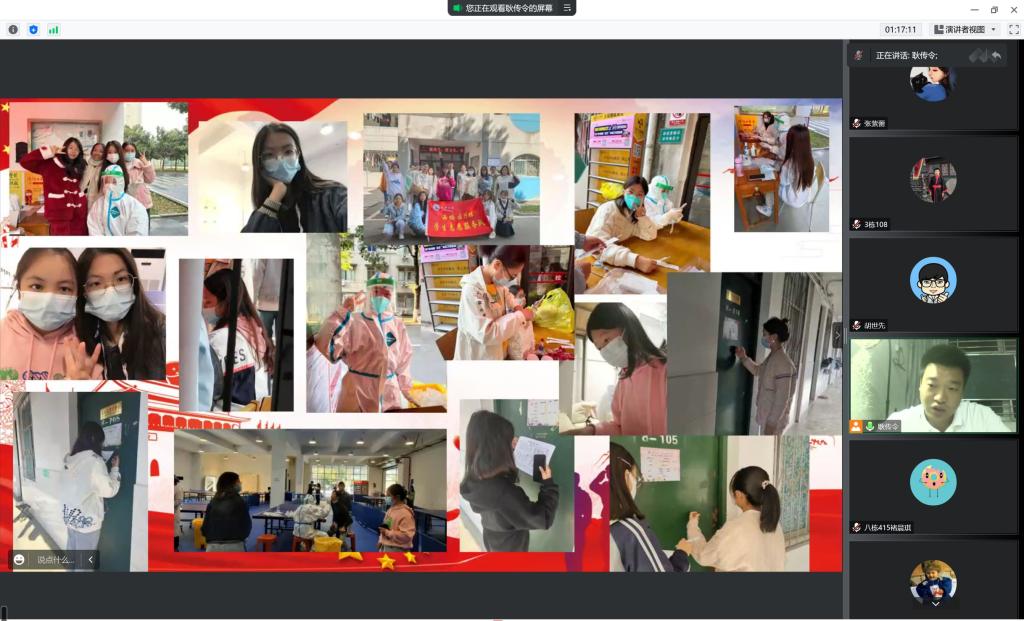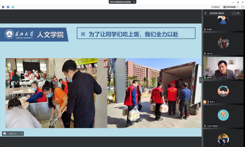 最后,胡世先老师分享了他的抗疫故事。他表示,为了让同学们吃上饭,学校老师全力以赴。在抗击疫情时,学校各位老师们不仅以老师的身份帮助着同学们,更是以志愿者的身份守护着同学们。他们战斗在没有硝烟的战场,为员工撑起“安全伞”。