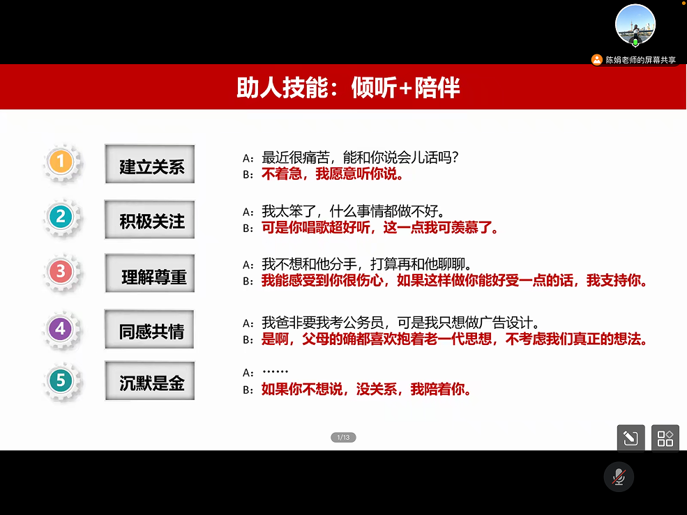 会议伊始,陈老师幽默提问:“今天,你网抑云了吗?”有趣地引出当今老员工被心理问题困扰已久的社会现象。随后,陈娟老师从认识心理健康、识别心理危机、正确应对心理危机以及公司心理健康教育体系四个方面,对老员工常见心理问题的识别与应对进行详细讲解。陈娟老师重点介绍了判断心理危机的三个标准,同时告诉员工干部们要注意身边同学的行为表现,要主动担任在危机干预中的职责,关心关爱身边的同学。“当他人出现心理危机时,我们应该给予尊重和陪伴,认真倾听,不着急给予建议,不做价值评判,认可对方的痛苦感受。”陈娟老师说道。